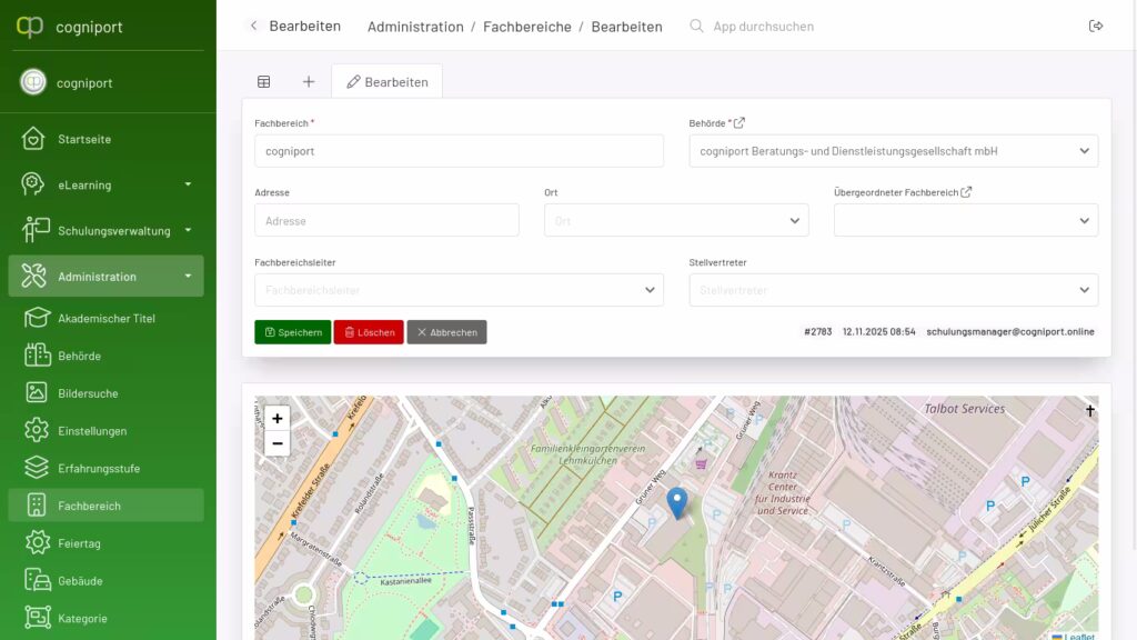 Sie sehen in der oberen Leiste (dem Brotkrumen-Menü), dass die App Fachbereiche geöffnet ist und diese in der Administration enthalten ist. Dies spiegelt sich ebenfalls im Menü auf der linken Seite wieder.