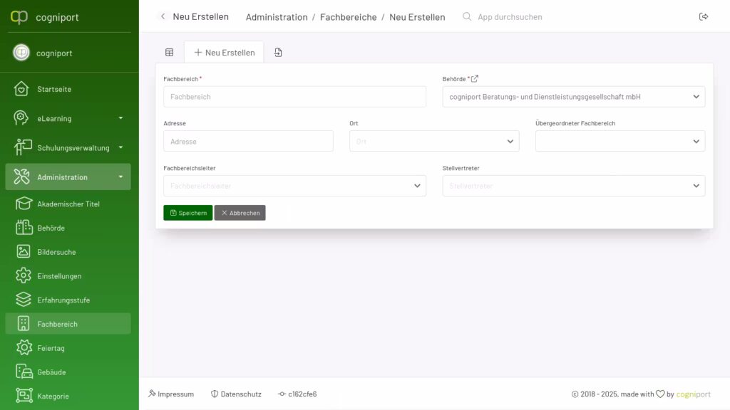 Wenn das Feld korrekt gefüllt ist, können Sie über den Punkt Speichern den neuen Fachbereich erstellen. Das Portal führt Sie zur Bearbeitung.