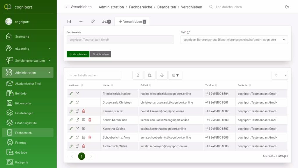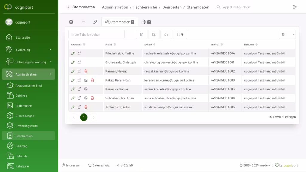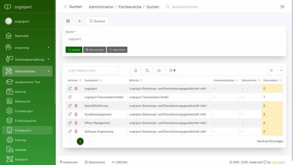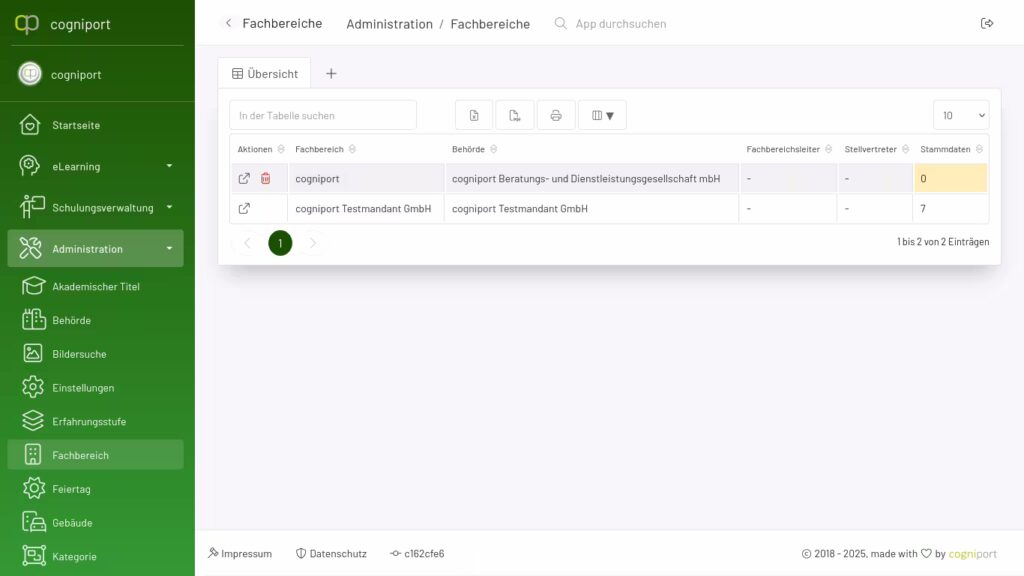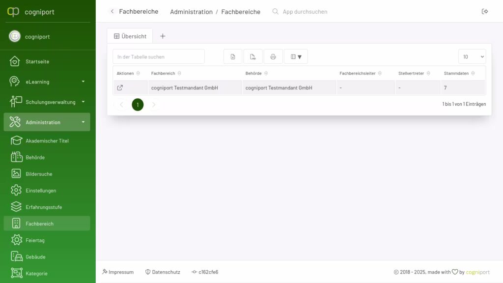 In der Mitte sehen Sie die zentrale Tabelle aller Fachbereiche, die durch Ihre Verwaltung angelegt wurden: